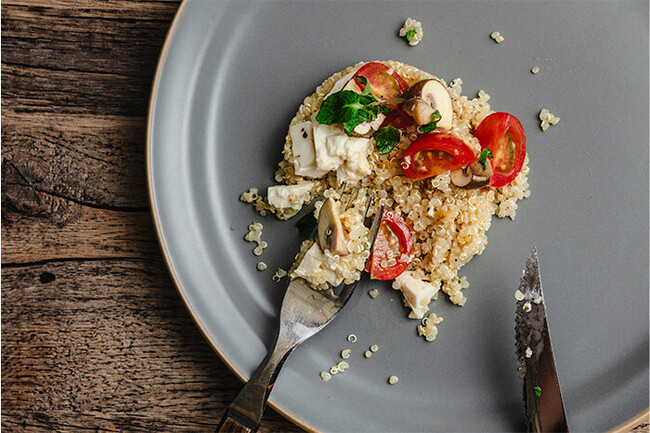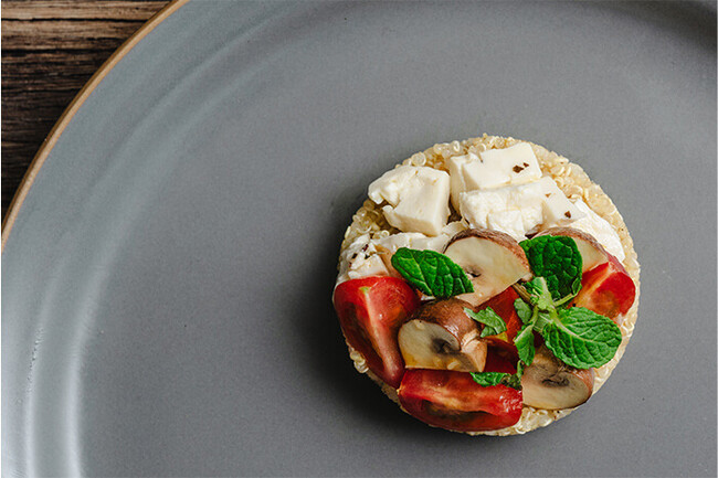 自家製の豆腐のフェタ風チーズとマッシュルームのピクルスをキヌアと合わせてサラダにしました。食感とそれぞれの味わいが美味しい一皿です。