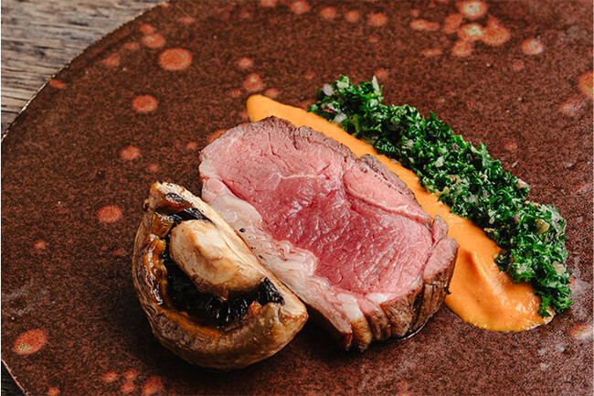 ジャンボマッシュルームのローストに旨みたくさんのラムのランプを合わせました。黄色いパプリカをベースにしたロメスコソースとさっぱりとしたサルサベルデ、それぞれを合わせたときのバランスの良さをお楽しみください。