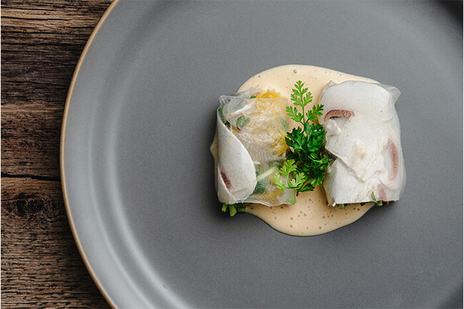 香りと味が豊かな江戸前ハーブとマッシュルームを生春巻きに仕上げました。自家製のスパイスオイルと豆乳で作ったオリジナルソースでお召し上がりください。