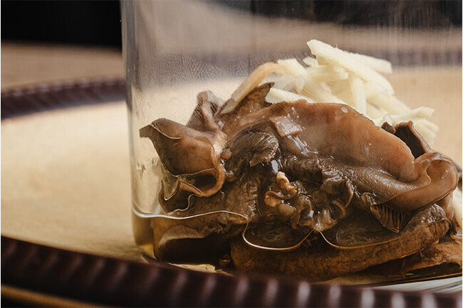 マッシュルームの旨みが増える60℃の温度帯で一時間出汁を取り、そのままジュレに仕立てました。「限界突破生姜」の爽やかな辛味と食感を感じながら、お召し上がりください。