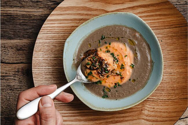 マッシュルームを豊富に使って濃厚に仕上げたマッシュルームスープに、トマトをベースにした爽やかな酸味を感じるサルモレホを合わせました。今の季節にぴったりの一品です。