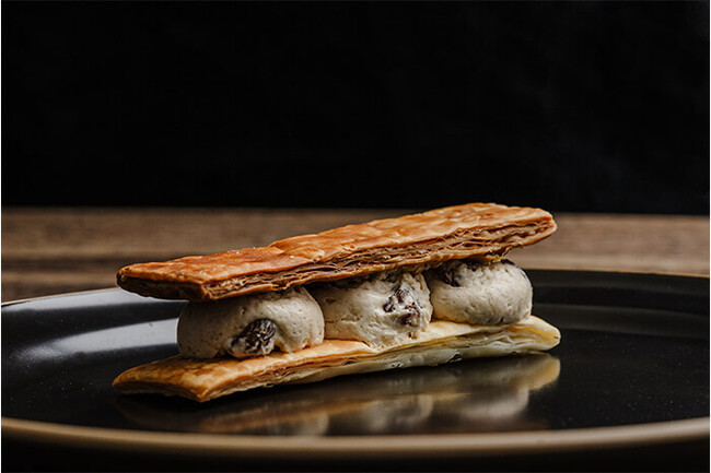 動物性のものを一切使っていないのに、バタークリームのようなコクを感じられるラムレーズンクリームを軽い食感のパイでサンドしました。クリームにはマッシュルームパウダーを加えて旨みをプラス。最後に口の中に広がるラムの香りが良いアクセントになっています。