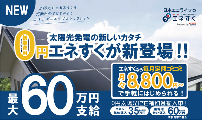 株式会社日本エコライフホールディングスが出光グループのソーラーフロンティア株式会社と提携し太陽光発電システムの月額サービス「エネすく」の提供を開始。