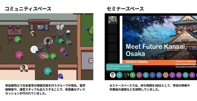 本イベントはヴァーチャルスペースを利用して行われ、参加者は各校のブースや説明会ステージを自由に移動しながら学校情報を収集することができます。学校ブースを見たり、他の参加者との自由な情報交換ができることで、海外学生に対し日本留学をもっとクリアに想像してもらうきっかけとなりました。