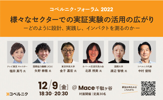本イベントは、コペルニク・ジャパンの年次活動報告会「コペルニク・フォーラム2022」として12月9日(金)にMace 千駄ヶ谷にて開催されます。実証実験にご関心のある方ならどなたでも大歓迎です。みなさまお誘い合わせの上、ご参加ください。