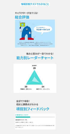 「ジョーカツ」とは、小学生から中学生までの教育課程においてPCやタブレット、インターネット活用を軸とした情報活用能力を診断することができます。本診断は、文部科学省が提示する情報活用能力体系表例※6に基づき情報活用能力における3つの大枠(1.基本操作、2.問題解決・探究スキル、3.情報モラル・セキュリティ)で構成されています。全28問の質問に回答すると、回答内容に応じて診断結果及びキャラクターが表示されます。