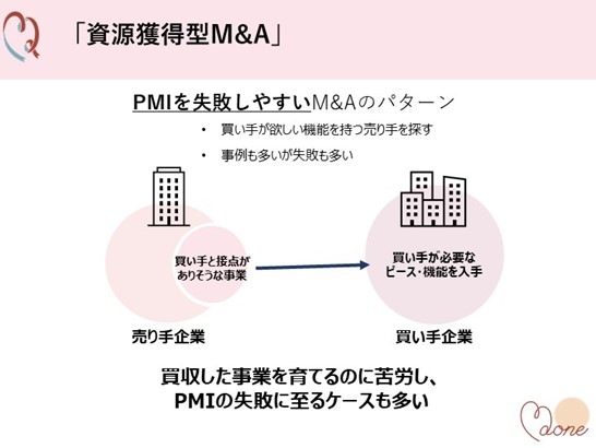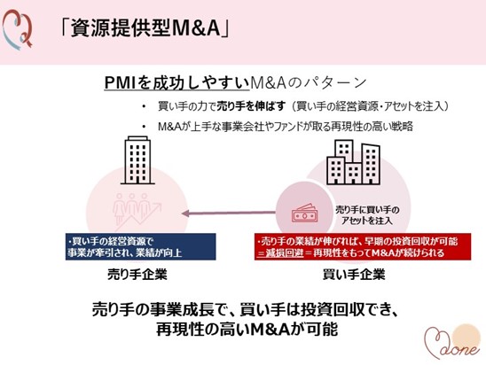 最近では、ファンドではない事業会社にても、売り手企業を成長育成するM&Aを志向する企業が目立つようになってきました。M&Aの形式を買い手企業の目線で2つに類型化すると、買い手企業が売り手企業に経営資源を提供して育てる「資源提供型M&A」と、売り手企業の経営資源を買い手企業の経営戦略に沿って取り入れる「資源獲得型M&A」に分類され、M&A後の売り手企業の成長については、「資源提供型M&A」の方が実現可能性が高く、成功事例が多く見られます。
