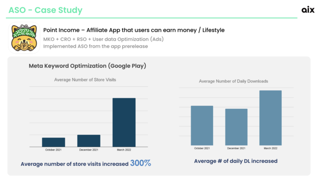 現在、aixは関連会社であるファイブゲート株式会社(代表取締役:山下雅弘)が運用するポイントアプリ「Point Income(ポイントインカム)」のASO施策を行なっております。