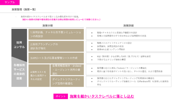 採用戦略のコンサルティングだけではなく、候補者へのアプローチ等の具体的なアクションも含めたご提案を実施いたします。