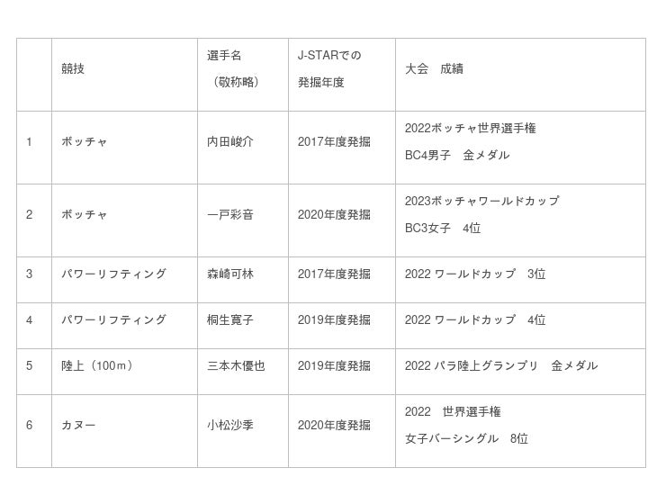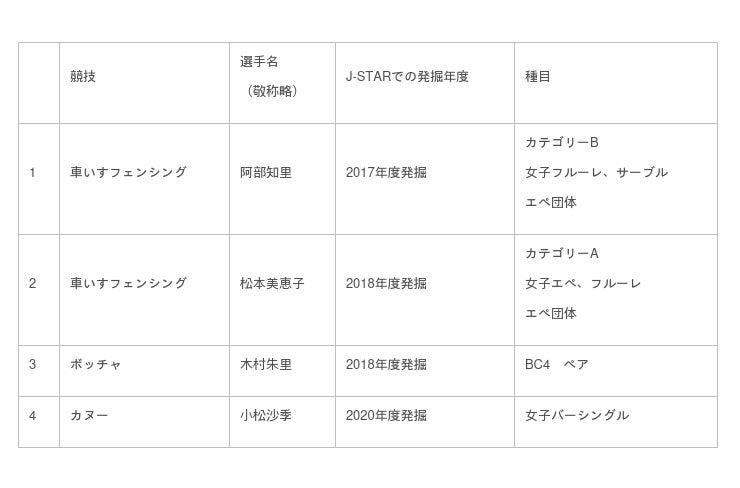 2017年度に開始したJ-STARプロジェクトにより発掘されたタレントは、これまでに下記の通りパラリンピック等の国際大会で活躍をしています。