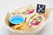 8種の具材を挟んだサンドイッチ、スープ、トルティアチップスのバスケット。フラッグ付。
