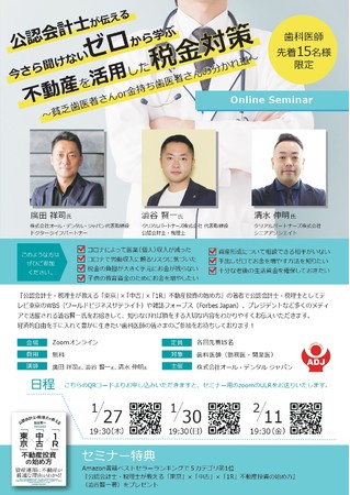 株式会社オール・デンタル・ジャパン(東京都台東区柳橋2-5-6)の協賛企業でもあるクリアルパートナーズ株式会社が、2022年1月27日(木)、1/30(日)、2/11(金)それぞれ19:30〜ZOOMにて、不動産を活用した税金対策の無料セミナーを歯科医師限定で開催いたします。
