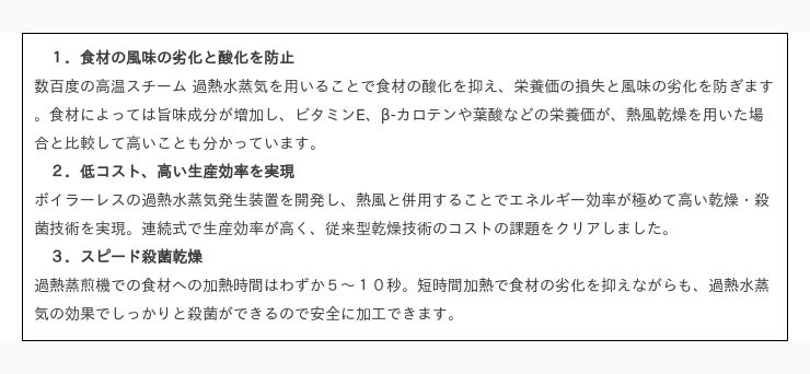 『過熱蒸煎機』は、食品の風味の劣化と酸化、栄養価の減少を抑えながら、乾燥と殺菌を同時に行うことが可能な装置です。以下の3つの特徴により、野菜の不可食部分や、米ぬか、果物の搾りかす、飲料ざんさにいたるまで、高付加価値化した食材にアップサイクルすることが可能です。