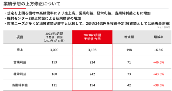 2023年3月期 第2四半期を終え、想定を上回る機材の高稼働率もあり、売上高・営業利益・経常利益・当期純利益を上方修正いたしました。