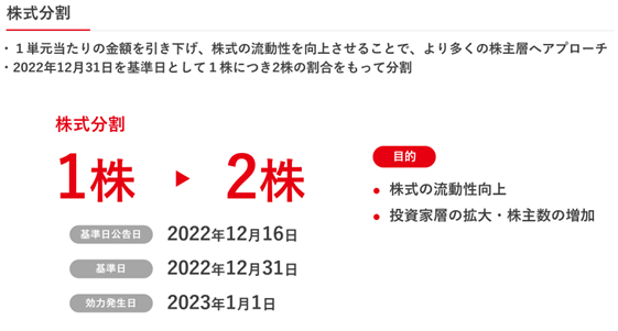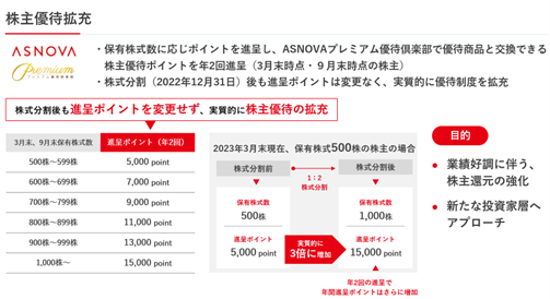 この度、業績好調に伴う株主還元の強化を目的として、株式分割による付与ポイントは株式分割前から変更せず、実質的に株主優待制度を拡充することを決定いたしました。
