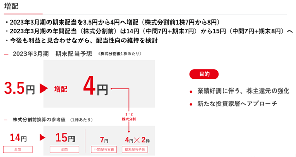 新たな投資家層にアプローチしていきたい、また株主還元の強化により、既存の株主様にも応援していただきたい思いもあり、増配を決議いたしました。