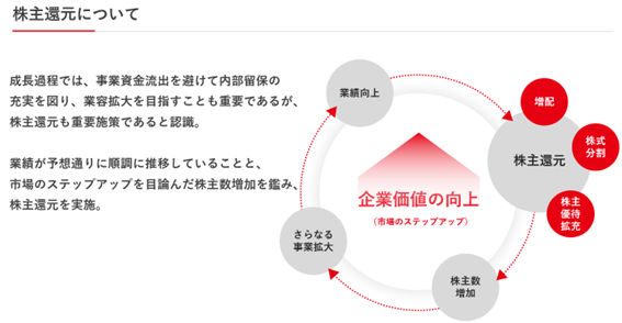 当社は現在成長過程にあり、事業資金流出を避けて内部留保の充実を図り、業容拡大を目指すことも重要ですが、株主還元も重要施策であると認識しております。績が予想通りに順調に推移していることと、市場のステップアップを目論んだ株主数増加を鑑み、株主還元の強化を決定いたしました。