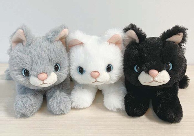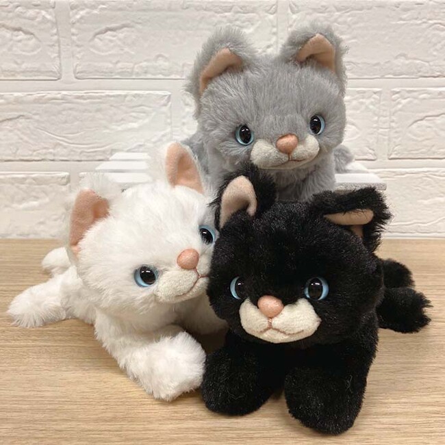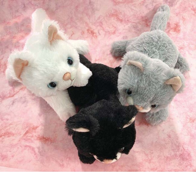 内容:好奇心旺盛な子猫のクルーナは、美しいアイスブルーの目が印象的。フサフサとした手触りの良い生地で出来ています。ホワイト、グレー、ブラックの3色展開なので、3匹揃えると可愛さが3倍増です。