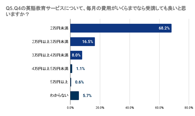 Q4で「受講したい」「料金が安ければ受講したい」「興味がある」と回答した人に、Q5で、「Q4の英語教育サービスについて、毎月の費用がいくらまでなら受講しても良いと思いますか?」と質問したところ、最も多い68.2%の回答者は2万円未満が適切と感じています。16.5%は2万円以上3万円未満、8.0%は3万円以上4万円未満と答えました。対照的に、4万円以上の費用を考える回答者は極少数で、4万円以上5万円未満が1.1%、5万円以上が0.6%でした。これにより、埼玉県では多くの人が3万円未満の価格帯を望んでいることが明らかとなりました。