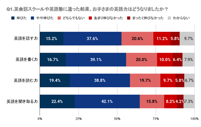 Q1で「英会話スクール、英語塾に通った結果、お子さまの英語力はどうなりましたか?」と質問したところ、埼玉県では英会話スクールや塾に通って英語のスキル向上を明確に感じられなかったと感じている人が一定数いることが分かりました。具体的には、英語を話す、書く、読む、聞き取る各スキルにおいて、「伸びた」と感じる人は約15%〜22%であり、一方で「あまり伸びなかった」や「まったく伸びなかった」と回答した人が合わせて約12%〜17%となっています。特に、「英語を話す力」と「英語を書く力」においては「あまり伸びなかった」と「まったく伸びなかった」の合計がそれぞれ16.9%、16.4%となっています。また、各スキルに関して「どちらでもない」と答えた人も含めると、28%〜38%となっており、明確な効果を実感していない人が一定数存在することが伺えます。