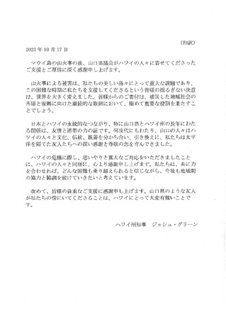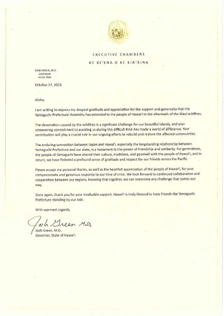 この度、山口県議会議長 柳居俊学様がハワイ州知事ジョシュ・グリーン様に救援金をお渡しになり、ハワイ州知事ジョシュ・グリーン様よりお礼状をいただきましたのでお知らせいたします。