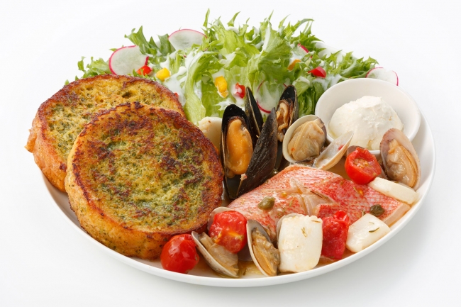バジル入りのフレンチトーストと、赤魚、ムール貝、イカ、アサリのアクアパッツァ(魚介類をトマト、オリーブオイルで煮込む料理) を組み合わせたヘルシーな一皿です。シーフードとバジルの味わいをお楽しみください。