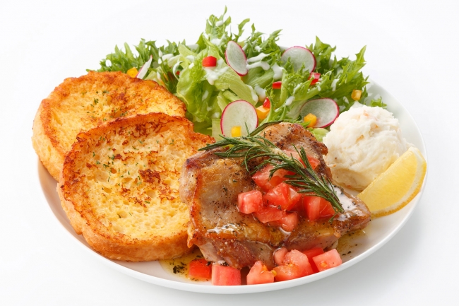 ビッグサイズのチキンをタイム、ローズマリー、ニンニクのハーブバターソースでソテーし、マリネしたトマトを飾りました。ハーブの薫りが食欲をそそり、フレンチトーストとの相性も抜群です。