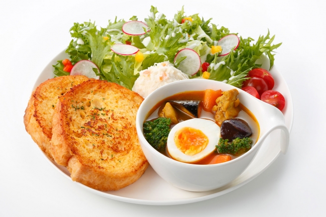 茄子、トマトなど夏野菜入りチキンスープカレーでフレンチトーストをお召し上がりください。