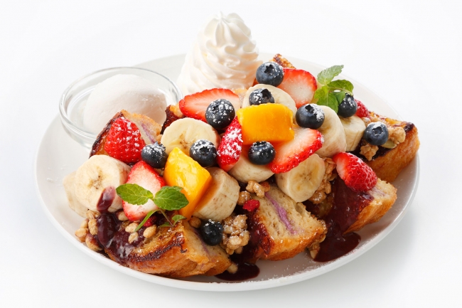 アサイーボウルをイメージし、アサイーソースをたっぷりかけたフレンチトーストに、盛りだくさんのフルーツとグラノーラを飾っています。