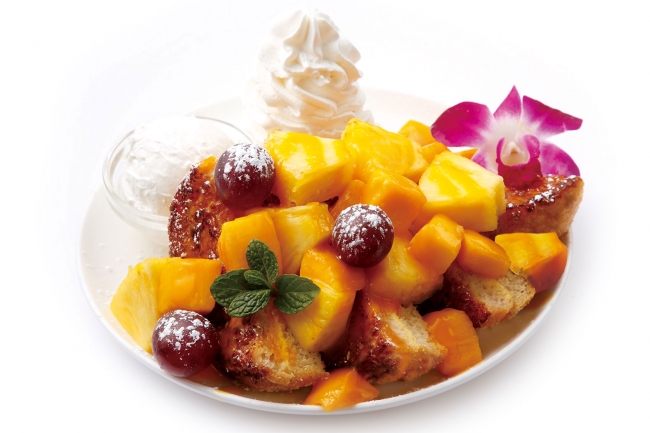 焼き上げたフレンチトーストに、マンゴーとパッションフルーツのエキゾチックソースをたっぷりかけて、アップルマンゴー、パイナップル、レッドグローブで飾りました。南国の香りいっぱいの一皿です。