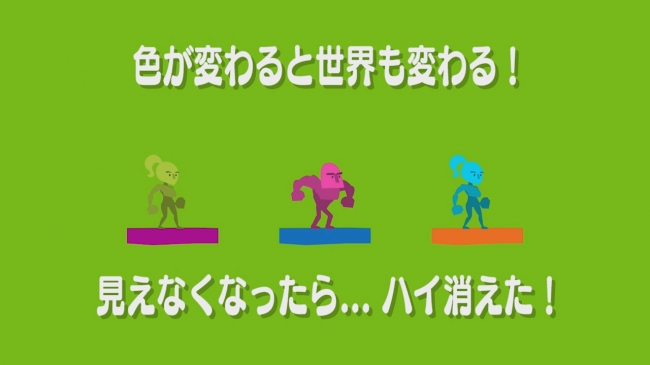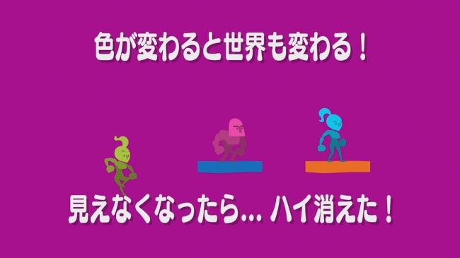 独特な色彩感覚を持つ世界観で、最大で9人同時プレイが可能なパーティーアクションゲームです。「色が変われば世界も変わる」「見えないものは存在しない」のコンセプトどおり、背景の色の変化に合わせて足場や障害物が現れたり消えたりするギミックを基本としています。