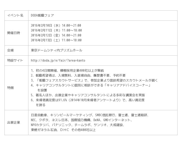 株式会社インテリジェンス(本社:東京都千代田区、代表取締役兼社長執行役員:高橋広敏)が運営する転職サービス「DODA(デューダ)」<http://doda.jp/>は、2月10日(水)、11日(木)、12日(金)、13日(土)、東京ドームシティ内プリズムホールにて「DODA転職フェア」を開催します。4日間の開催は今回が初めてです。