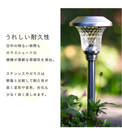 ボディはステンレス、シェードはガラス製なので、見た目の高級感はさることながら、耐久性が高く、変色が少ないのが特徴です。日中の明るい時間帯の佇まいも品があり、ガラスシェードに当たる日差しが綺麗です。