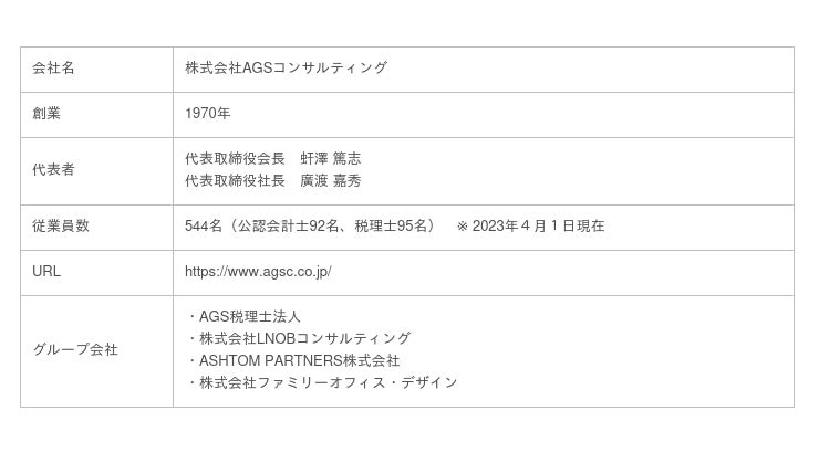 1970年に創業し、88年にAGSコンサルティングを設立。国内7カ所、海外6カ所に拠点をもつ。税務相談などを実施するAGS税理士法人とともにAGSグループを構成し、544名(2023年4月現在)が在籍する。AGSはAccounting Global Serviceの略称で、一般的な税務会計にとどまらず、M&A、IPO支援、国際業務、企業再生、事業承継支援など、専門性の高い多彩なサービスをトータルで展開している。