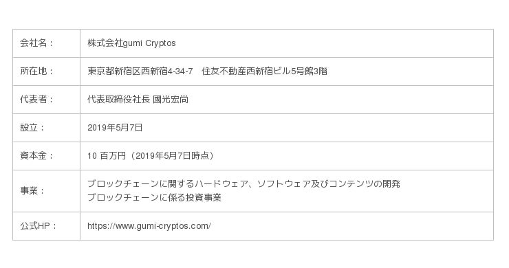 gumi Cryptosはモバイルオンラインゲームの開発、配信を行うgumiの連結子会社で、ブロックチェーンに関するハードウェア、ソフトウェア及びコンテンツの開発、及びブロックチェーンに係る投資を行っております。