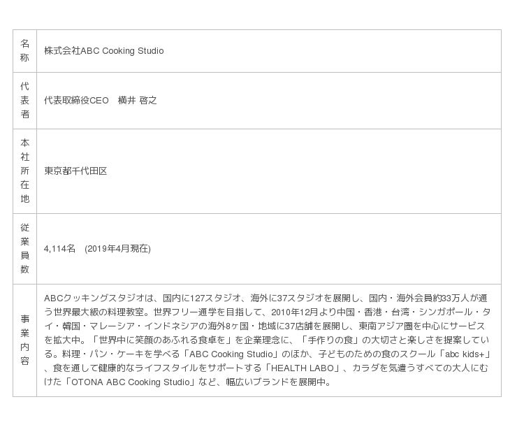 ロート製薬株式会社(本社:大阪府大阪市、代表取締役社長:杉本雅史)、株式会社ABC Cooking Studio(本社:東京都千代田区、代表取締役CEO:横井啓之)、株式会社コクミン(本社:大阪府大阪市、代表取締役社長:絹巻秀展)の3社は、2019年7月21日(日)、将来妊娠を望むうえでも大切なカラダづくりのための正しい知識や食生活について地域に根差した情報発信を行うことを目的とした3社共同プロジェクトを発足いたしました。