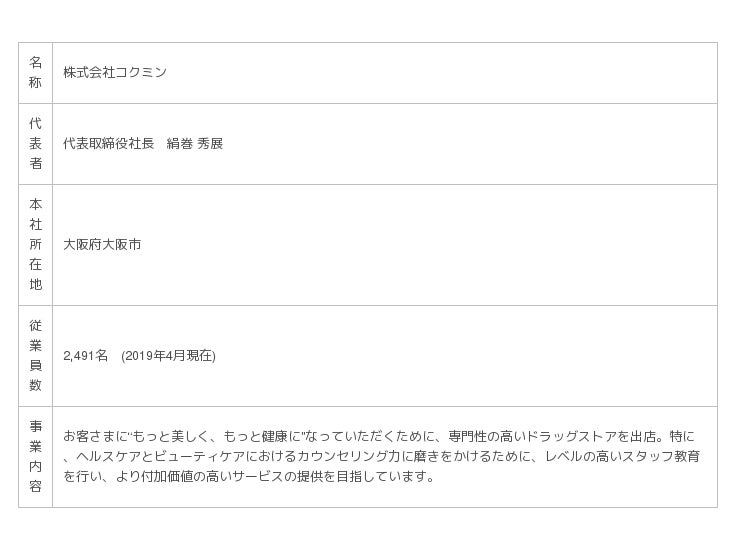 ・株式会社コクミン「国民の美と健康に奉仕する」を企業理念に掲げ、2016年6月より子育て中のパパ、ママを応援する“イクミンカード”メンバープログラムをスタート。ママキッズフェスタなどの子育て支援イベントなどにも積極的に参加しています。また、女性向けの美肌セミナーやサプリメントセミナーなど協力企業とのコラボ企画も積極的に行っており、2018年にはロート製薬様とのコラボ企画として 女性限定の“美味しく食べてキレイに”をテーマに内外美容を訴求したランチ女子会なども開催しております。