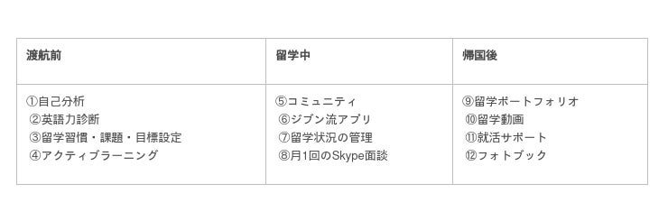 今回調査を行った『ディーサイド留学情報センター(商号:株式会社アットワールド)』(https://www.d-sidejp.com/)は、コーチング型の留学サービス『ジブン流学』を提供しています。留学の成果は現地での過ごし方や行動量、具体的なゴールを持つかによって大きく異なります。しかし、これらのことを理解していても自分一人で管理して継続ができている人は少ないのが現状です。またコロナウイルスの影響などで、個々のスキルが重視され、今後の留学は語学以外にグローバルスキル、自分の強みなどの周りと差別化できる留学をしないと、就職や成?に繋げることは難しいでしょう。ジブン流学は受動的な留学をするのではなく、こちらが未来の成?やキャリアに活きるための道しるべを与えることでお客様が主体的に考えて質の高い留学ができる従来にないコーチング型の留学サービスを提供します。一人で留学を成功させるのが難しいのならジブン流学が成功するためのレールをひき、お客様が進めるよう貢献してきます。■12のサービス