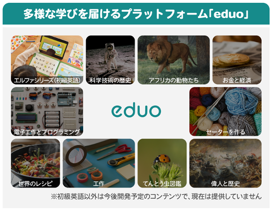 「eduo」の特徴は、教材が定期配送される定額の通信教材とは異なり、子どもの興味やレベルに合わせ必要なコースが選べる、良い意味での「体験のつまみ食い」ができる買い切り型のサービスであることです。