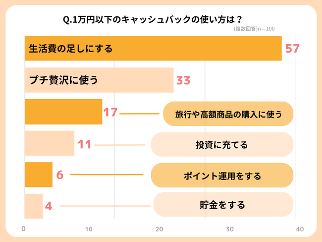 少額キャッシュバックの用途では「生活費の足しにする」が1位となり、高額キャッシュバックをもらっても同様の使い方をする人が一定数いることがわかりました。