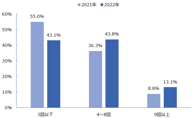 指名委員会の年間開催回数・時間をみると、開催回数が4回以上の企業の割合は56.9%(前年比11.8ポイント増)となっており、8時間以上開催している企業の割合は22.5%(同9.4ポイント増)と増加傾向にある(図1、2)