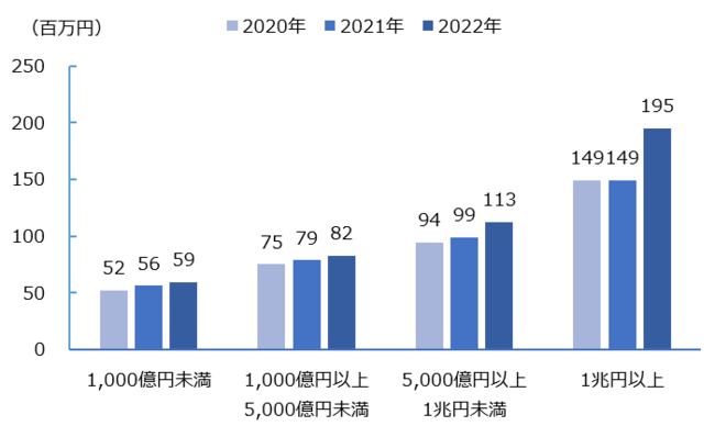 直近3年間連続して本サーベイに参加している企業群において、2022年の社長の総報酬額(中央値)は8,093万円であった。時価総額別(「1,000億円未満」、「1,000億円以上5,000億円未満」、「5,000億円以上1兆円未満」、「1兆円以上」の4つの企業群)の推移をみると、概ね報酬額は増加の傾向を示した(図7)。特に「1兆円以上」の企業群では1億9,500万円となっており、前年比30.7%と大きく増加した。