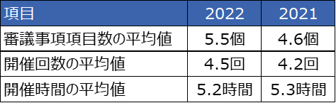 直近2年連続で「報酬委員会を設置している」と回答した企業237社をみると、報酬委員会の開催回数の平均値は4.5回(前年比0.3回増)、合計開催時間の平均値は5.2時間(同0.1時間減)であった(表2)。