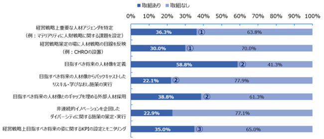 人材版伊藤レポートで掲げられている経営戦略と人材戦略の連動について、本サーベイ参加企業の具体的な取組状況をみると、経営戦略上で重要な人材アジェンダを特定する企業や、人材戦略の目線を反映する企業は30%程度となっている(図51.)。およそ60%の企業が目指すべき人材像を定義できていると回答した一方、その目指すべき人材像に紐づく育成施策や採用施策を打ち出せている企業はそれぞれ約20%、約40%となっている(同2.)。また、人的資本経営の実効性を担保するために重要となる指標(KPI)の設定状況をみると、経営戦略上目指すべき将来の姿に関するKPIの設定とモニタリングを行っている企業は35%となっている(同3.)。