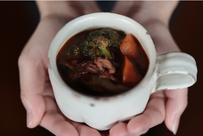 口に入れるととろけるようにやわらかい猪肉のしぐれ煮、豊潤な香りと旨味たっぷりの肉汁を凝縮した肉厚な原木椎茸、そして肥沃な土地で育った色鮮やかな野菜をたっぷり煮込んだ濃厚なブラウンシチューのスープとなっています。