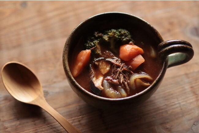 当社が製造するドレッシングの副産物であるオニオンスープをベースに、高品質なジビエ肉と国内生産量が約10%の希少な原木椎茸に加え、地元野菜をふんだんに使用したスープです。地産地消にこだわり、メイン食材の多くを多良木町内から仕入れて製造しています。