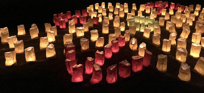 初黄・日ノ出町地区の京浜急行線高架下にある広場「ロックカク」に、色とりどりの灯明(とうみょう)による幻想的な景色が現れます。数千個のペーパーランプが織りなす地上絵や、ほのかな灯りがゆらめく光景は街なかに非日常的な雰囲気を生み出します。