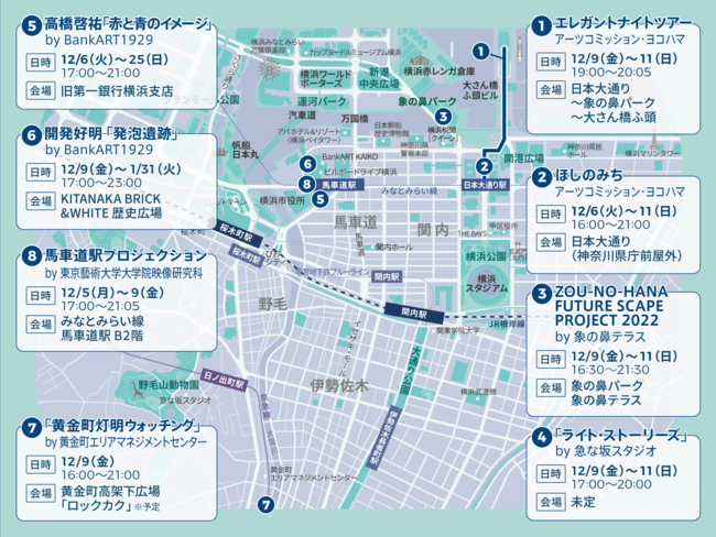 横浜スタジアム・横浜公園・日本大通りで実施する「BALLPARK FANTASIA」をはじめ、旧市庁舎街区の仮囲いでのアート作品展示、大通り公園でのライティングコーンの設置、関東学院大学横浜・関内キャンパスでのクリスマスツリー設置など、様々な取組が行われます。