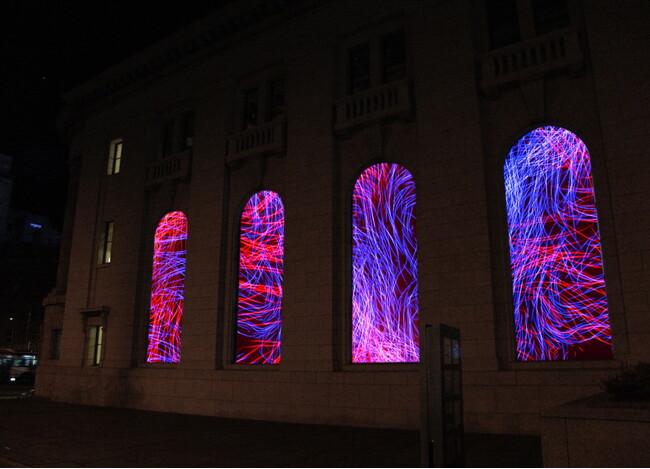 馬車道駅上に建つ歴史的建造物「旧第一銀行横浜支店」。この建物の特徴的な形をした窓をスクリーンとし、映像作家・高橋啓祐の作品を投影します。高橋は、ニブロールの映像・照明・美術としても活躍し、「大地の芸術祭越後妻有トリエンナーレ」など国内外で様々な作品を発表しています。本作では、まるで建物が街を照らす行燈のように光に包まれる姿をご覧ください。