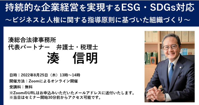 『持続的な企業経営を実現するESG・SDGs対応〜ビジネスと人権に関する指導原則に基づいた組織づくり〜』 8月25日(木)に無料オンラインにて開催